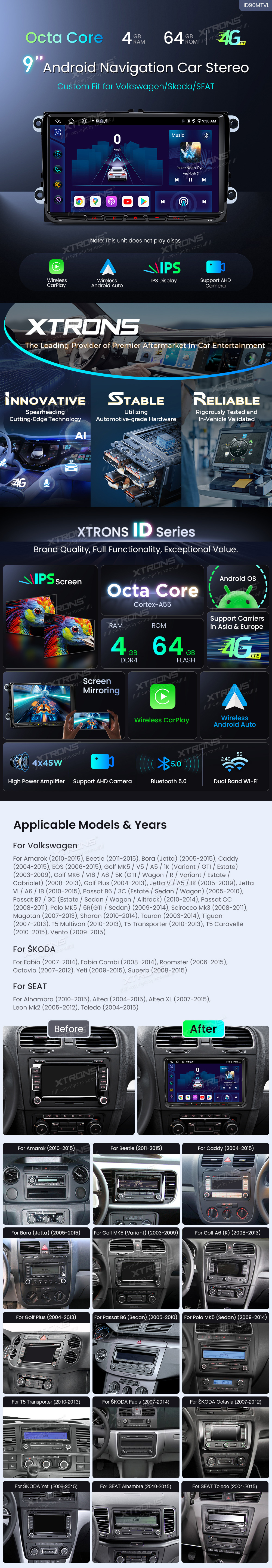 Autoradio con navigazione Android Octa Core da 9 pollici 4+64 GB, personalizzata per Volkswagen/Skoda/Seat